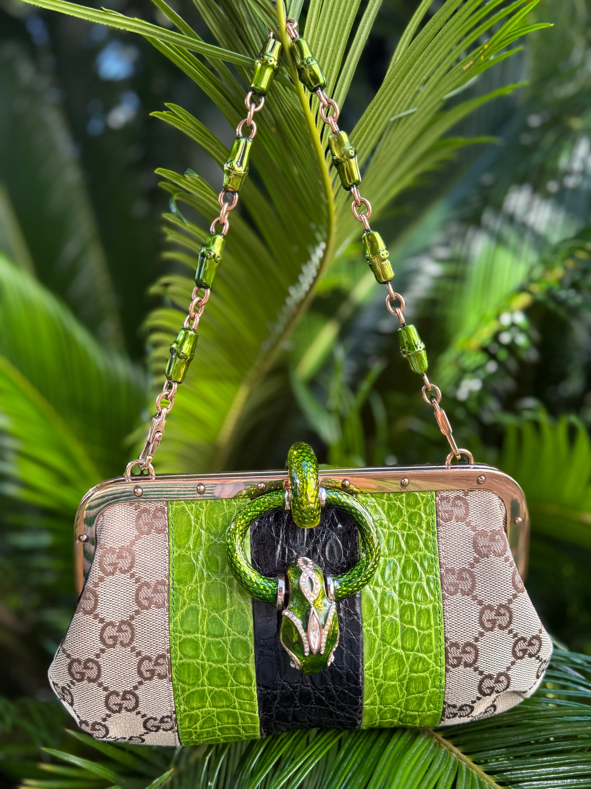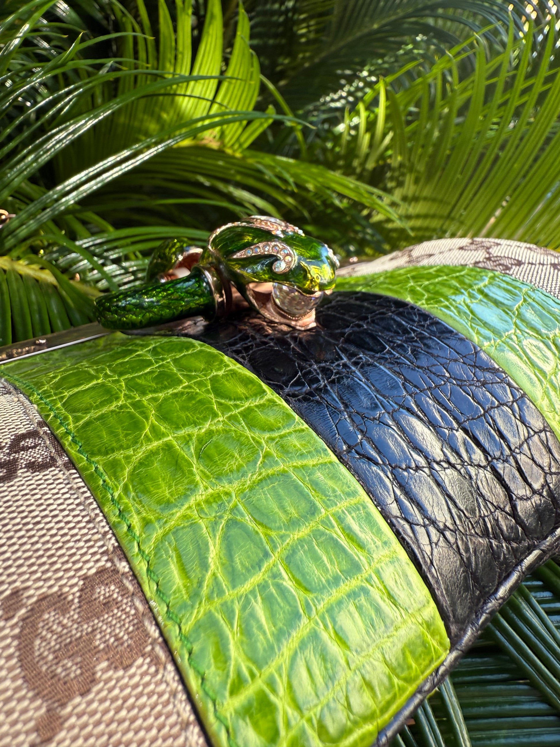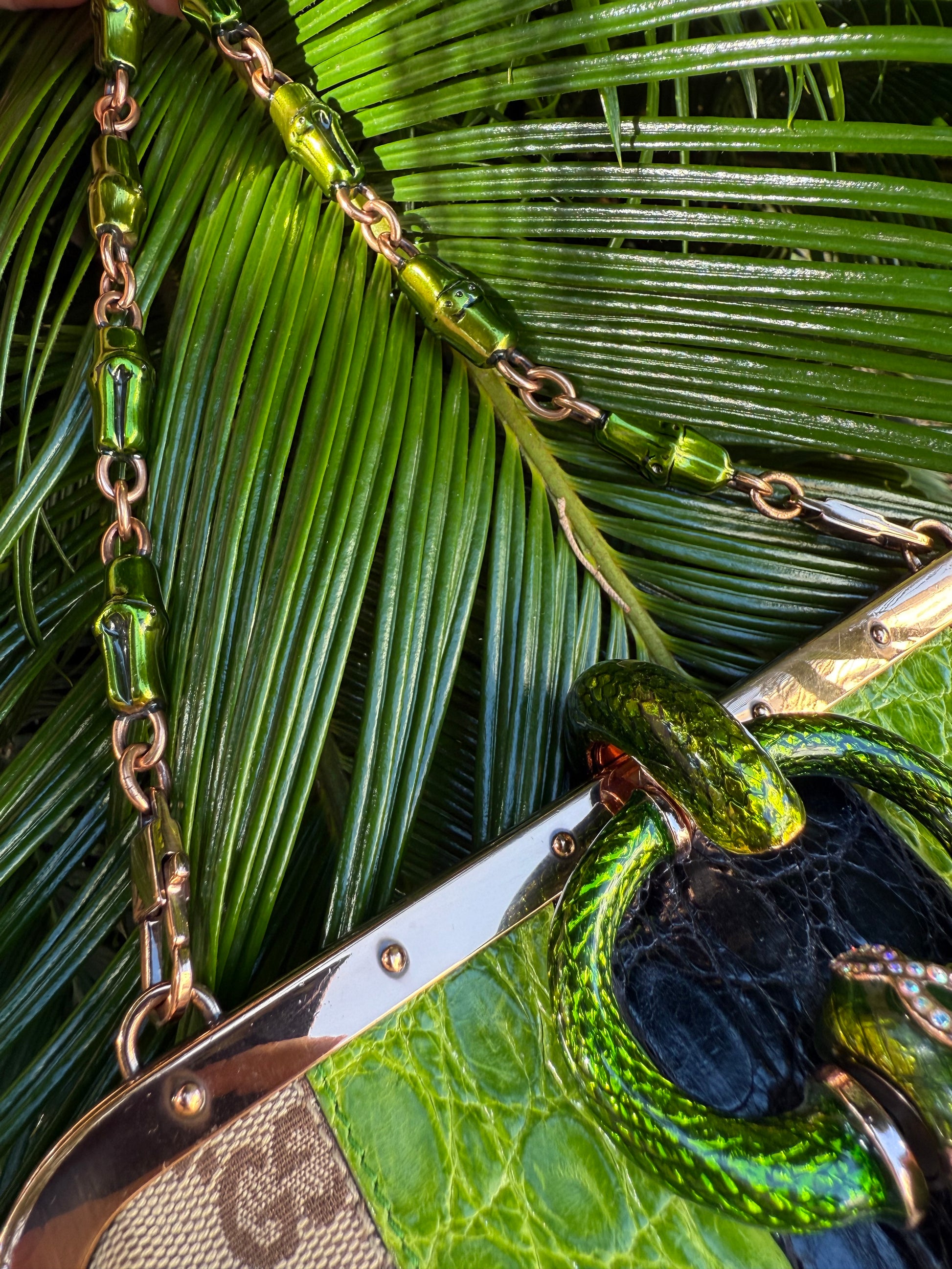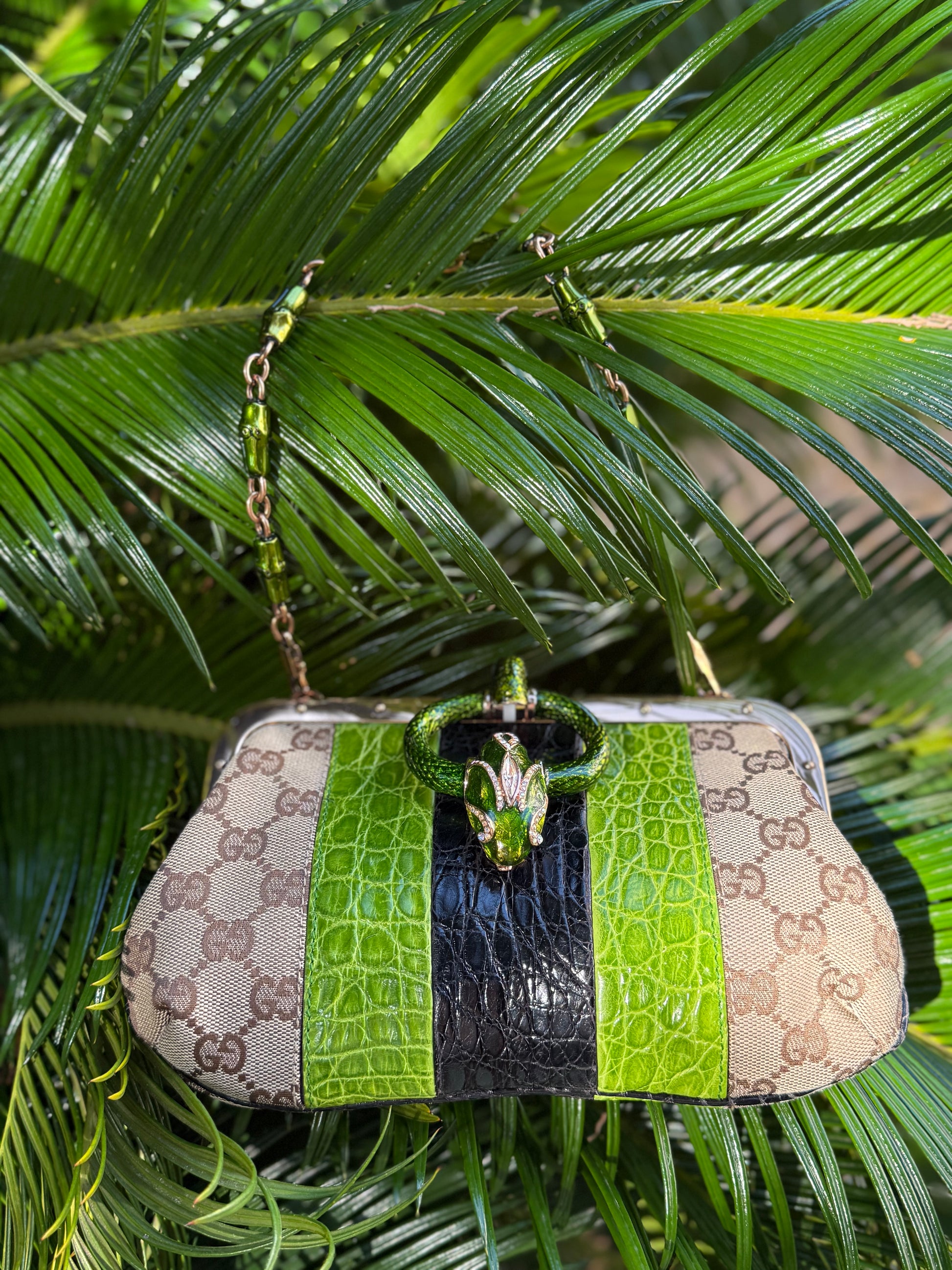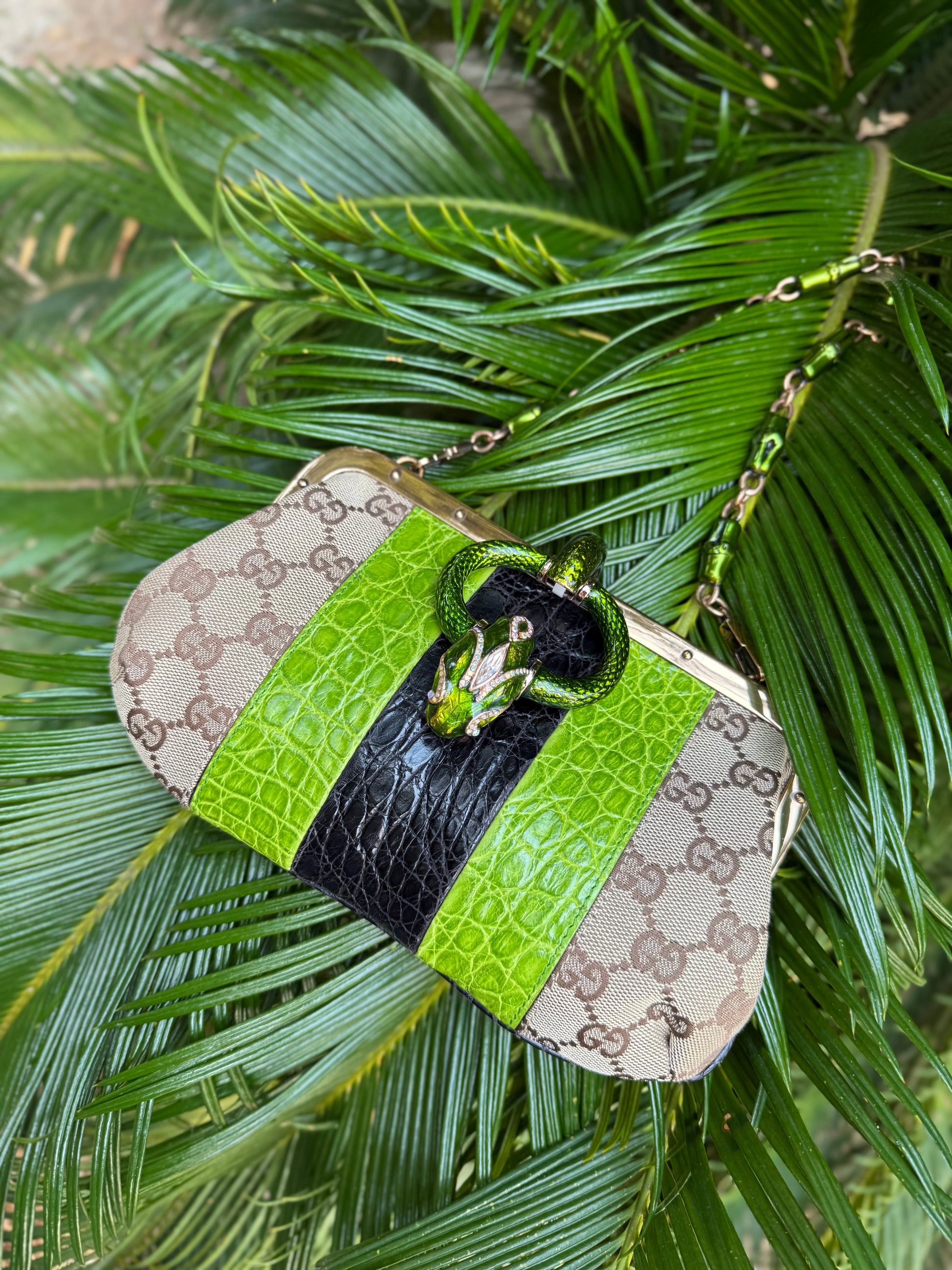 Extremely rare iconic Gucci by Tom Ford Spring/Summer 2004 Runway Dragon purse 🐉🐲🐉Material: Exterior - black and green alligator skin, G-logo canvas, interior: green silk.